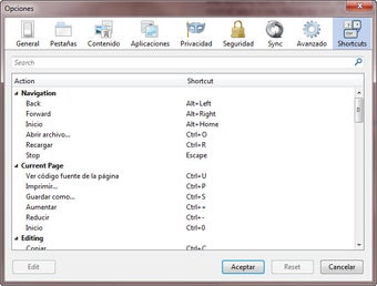 Customizable Shotcuts es muy rápido de instalar y no requiere reiniciar Firefox. Una vez en tu navegador, solo tienes que ir al apartado Opciones y verás una nueva pestaña con la lista de atajos y la posibilidad de cambiarlos mediante el botón Edit.